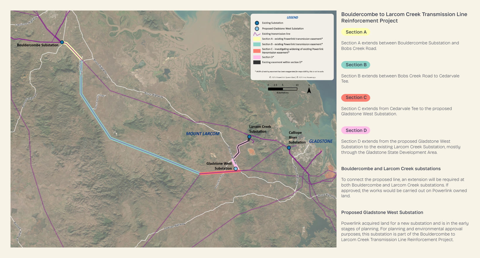 For planning and environmental approval purposes, this substation is part of the Bouldercombe to Larcom Creek Transmission Line Reinforcement Project.