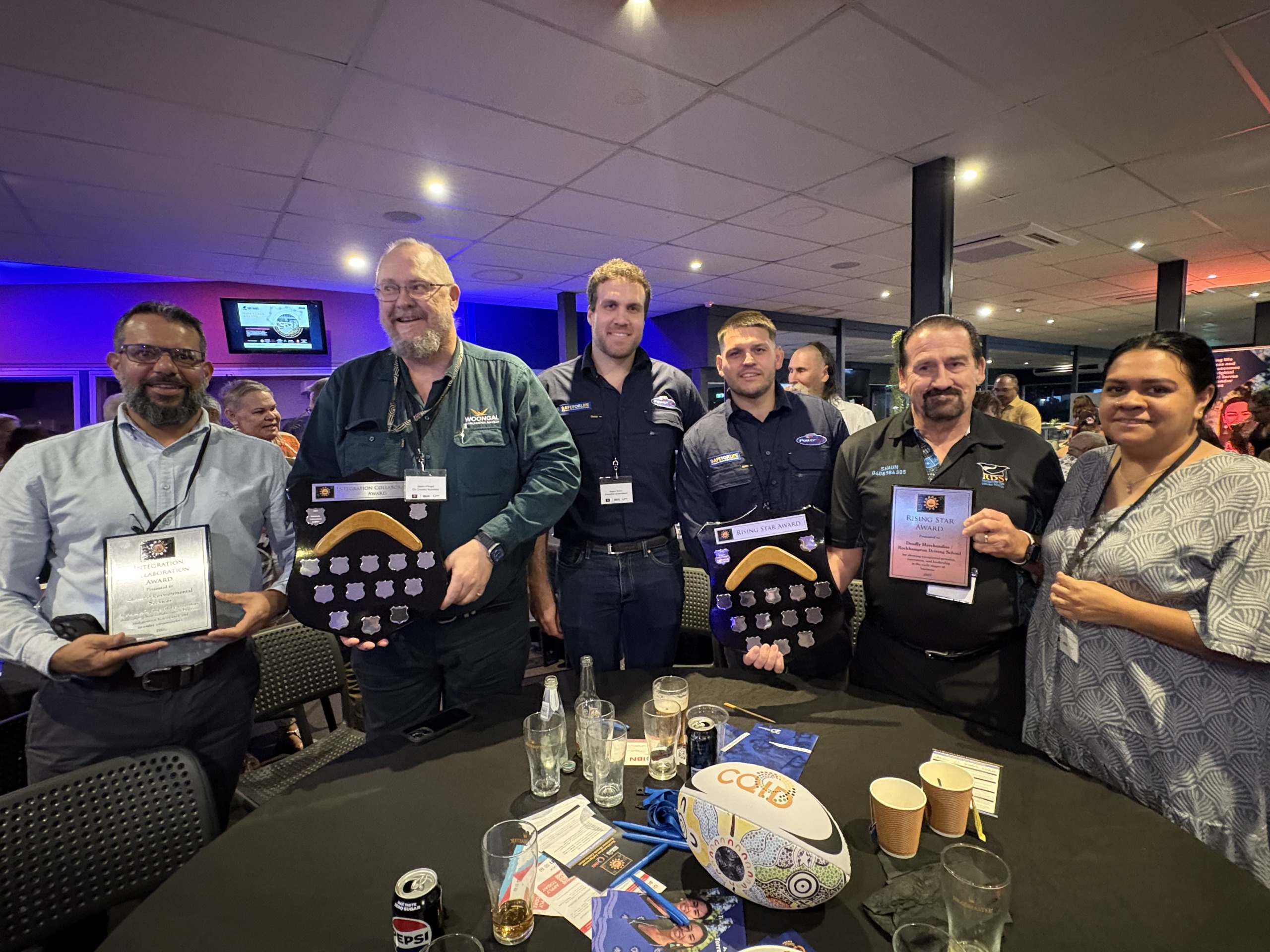 Kallan and Carlin from Powerlink (centre) are pictured with representatives from On Country Business (left), Deadly Merchandise and Rockhampton Driving School (right).