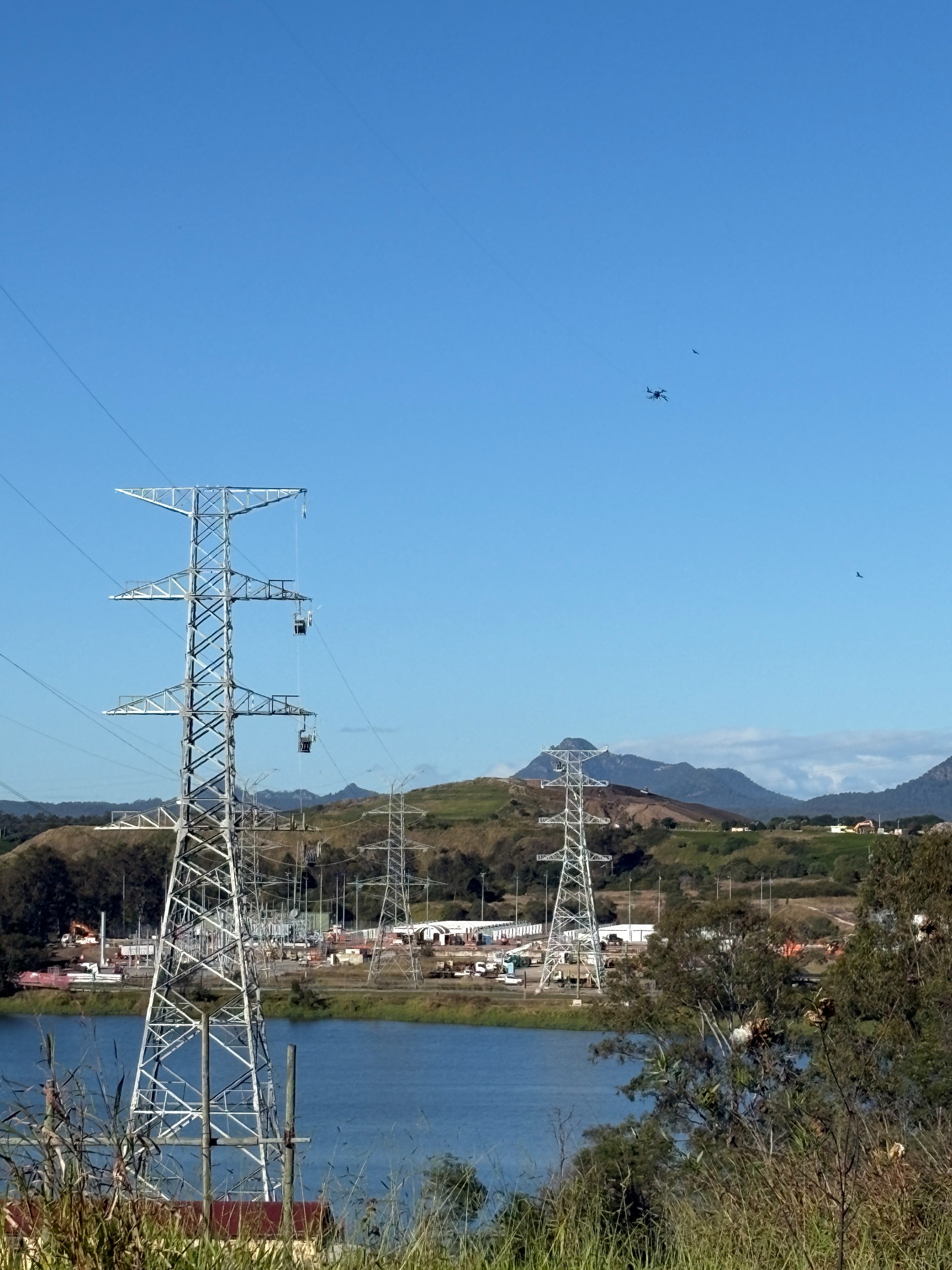 This approach was successfully demonstrated during works associated with the delivery of CleanCo’s 250MW Swanbank Battery Energy Storage System connection at Swanbank Power Station. Faced with varied terrain and complex stringing requirements, the Powerlink team used drone technology to safely and efficiently draw wire between structures, proving the method’s value in real-world conditions.